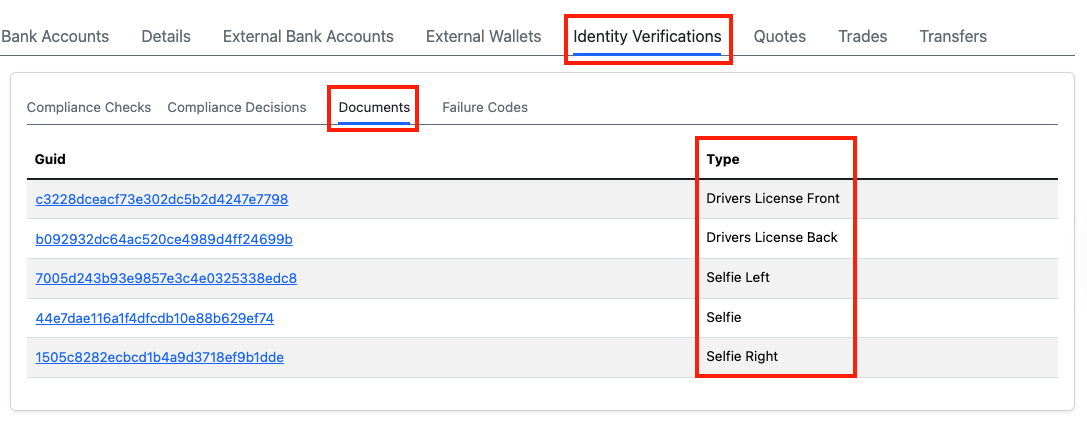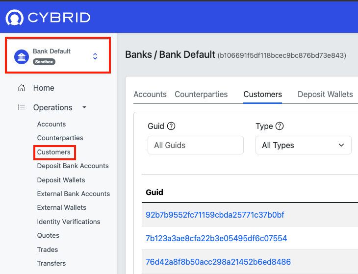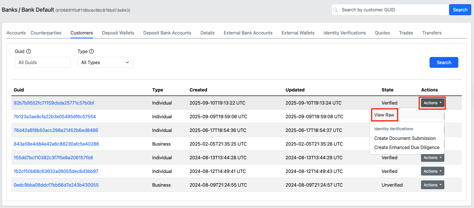 From here, you can either (1) search for a specific customer by their GUID or (2) filter the customer list based on their Type. Finally, click on the desired customer GUID hyperlink to navigate to their page and access more details about that customer, such as their KYC/KYB attempts, trades, transfers and more.