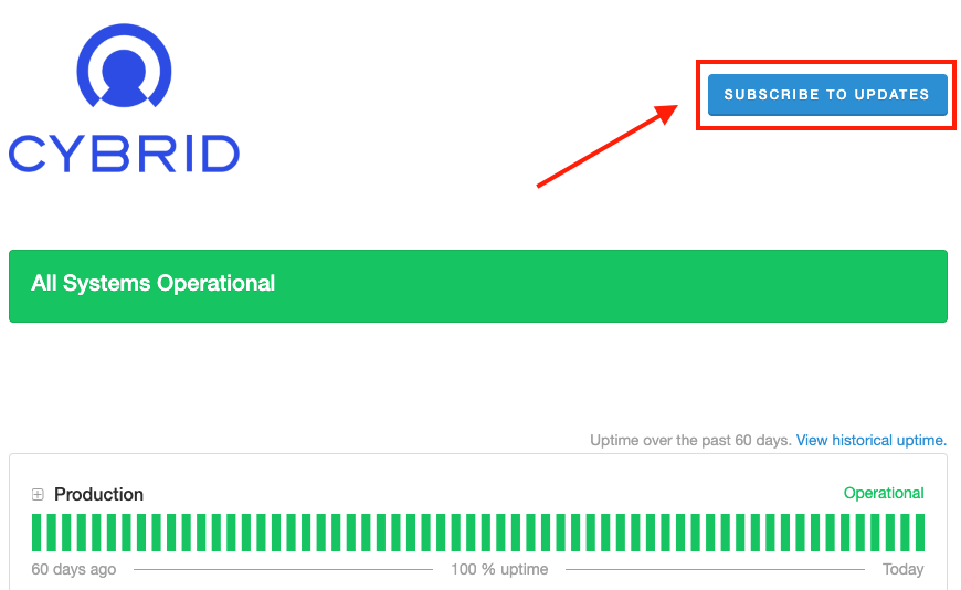 Stay informed about the Cybrid Platform’s current status and any upcoming maintenance or incidents by subscribing to our status updates. Our dedicated status page provides real‑time information on system health, historical incident reports, and scheduled maintenance. Simply visit here to subscribe and view the current status.